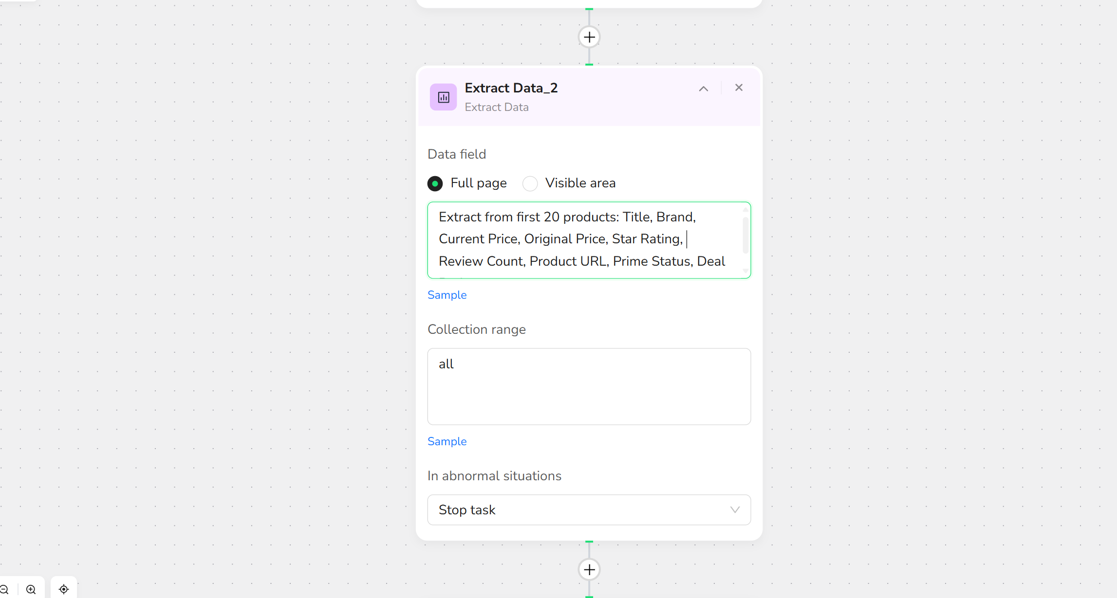 - Click "+" and select "Extract Data." In the description box, specify what to extract and set limits, such as: