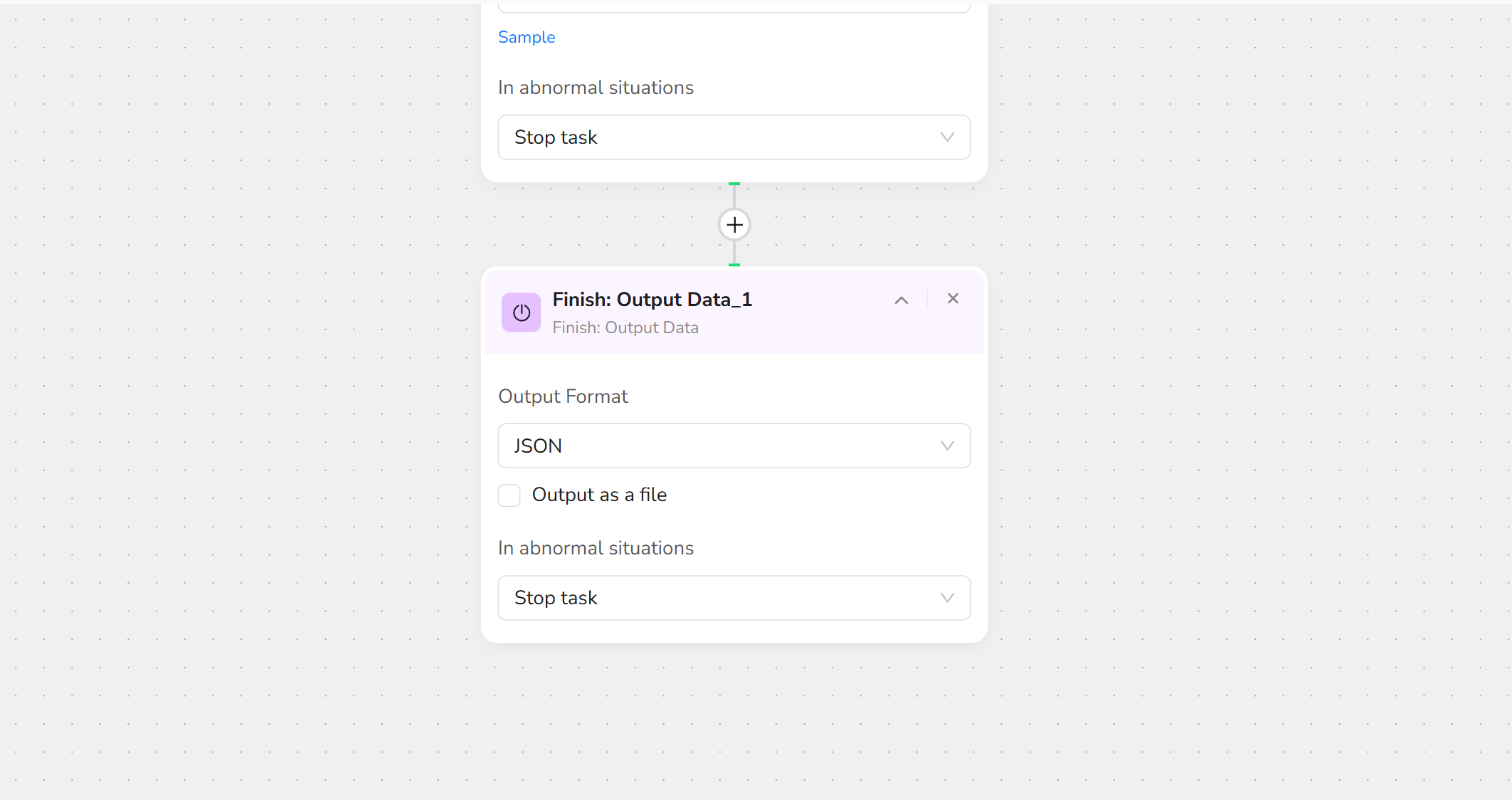 - Click "+" and select "Finish: Output Data." Choose CSV as the output format and enable "Output as a file" for easy downloading.