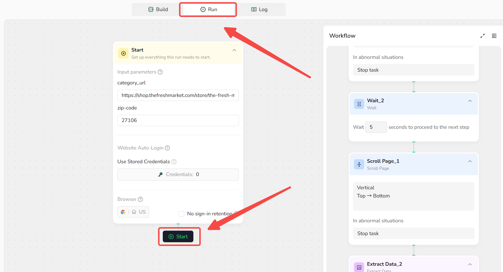 - Navigate to the "Run" section. Adjust parameters if Forbes (or use defaults), then click "Start" to execute the scrape.