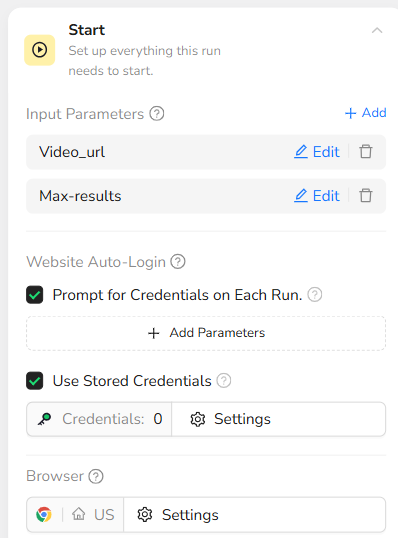 Video_url(e.g., "https://www.youtube.com/watch?v=dQw4w9WgXcQ") andMax-results(e.g., 20) – or use defaults to learn how to scrape YouTube quickly. - Start Execution: Click "Publish" to run the workflow.
