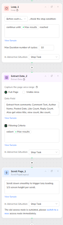 Why Use Loop List: When extracting large numbers of comments (especially 50+), YouTube uses lazy loading that requires scrolling to reveal more content. The Loop List node creates a parent-child structure that allows you to scroll incrementally and extract data in batches, ensuring complete and accurate comment collection.